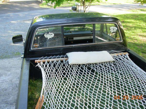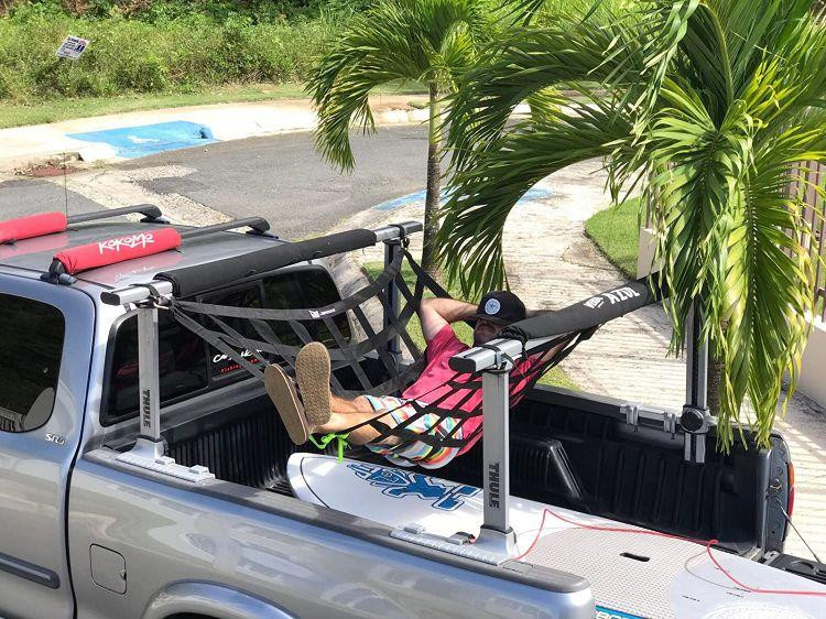 Với khoản đầu tư nho nhỏ, bạn có thể đan cho mình một chiếc võng lưới ở không gian phía sau xe bán tải. Nhiều người chỉ sử dụng lại lưới chở hàng bình thường và buộc chúng lại thật chặt để có hiệu quả tương tự. Như hình minh họa, chúng ta cũng có thể lấy một chiếc võng lưới và buộc vào mặt trước và mặt sau phần thùng xe. Để có trải nghiệm cao cấp hơn, hãy sử dụng loại vải dệt bằng đàn hồi chịu lực nặng với nhiều điểm tiếp xúc xung quanh viền thùng.