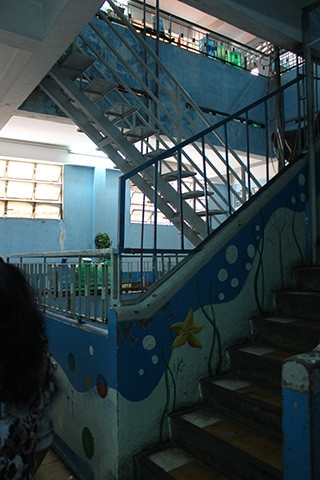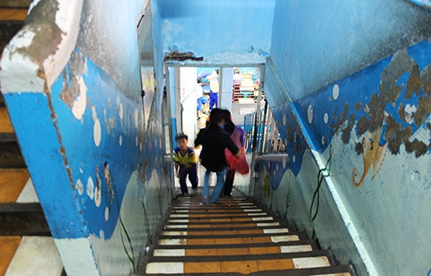 | ầu thang lên trường ngoằn ngoèo, cao, nhỏ hẹp nếu đi hai chiều học sinh sẽ phải xếp thành 2 hàng, một đi xuống một đi lên. |