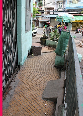 | Hai bên tường từng mảng vôi vữa bong tróc, xuống cấp. |