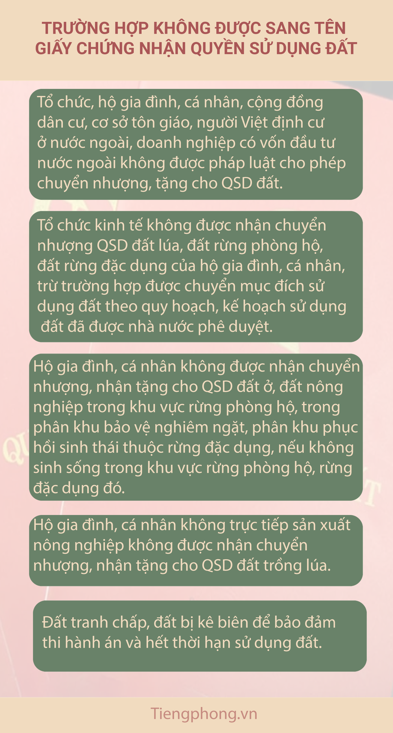 TPO - Theo quy định của pháp luật (căn cứ Khoản 1 Điều 168, Điều 191 Luật Đất đai 2013 ) một số trường hợp sẽ không được nhận chuyển nhượng, nhận tặng cho quyền sử dụng (QSD) đất, hay còn gọi là “sổ đỏ”.