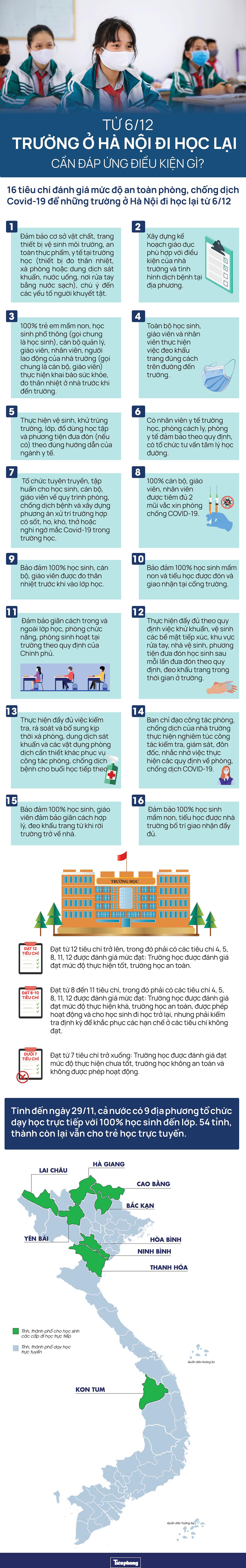 TPO - Hà Nội cho phép học sinh lớp 9, 10, 11, 12 và trung tâm giáo dục nghề nghiệp - GDTX toàn thành phố trở lại trường học trực tiếp từ ngày 6/12. Trường học phải đạt yêu cầu an toàn trong phòng, chống dịch Covid-19 theo các tiêu chí dưới đây.