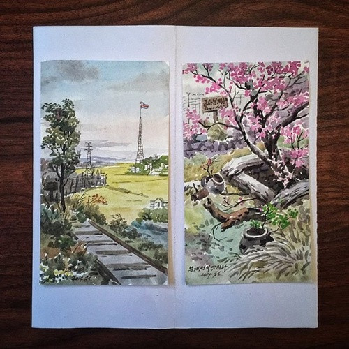 Bức tranh màu nước vẽ lại quang cảnh khu phi quân sự phân chia hai miền bán đảo Triều Tiên bên trong một cuốn sách được làm bằng tay.