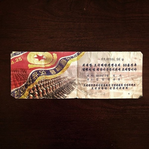 Giấy mời tham dự lễ diễu binh diễn ra tại Quảng trường Kim Nhật Thành vào ngày 27/7/2013 nhân kỷ niệm 60 năm ngày Hiệp định đình chiến ở Triều Tiên được ký kết.