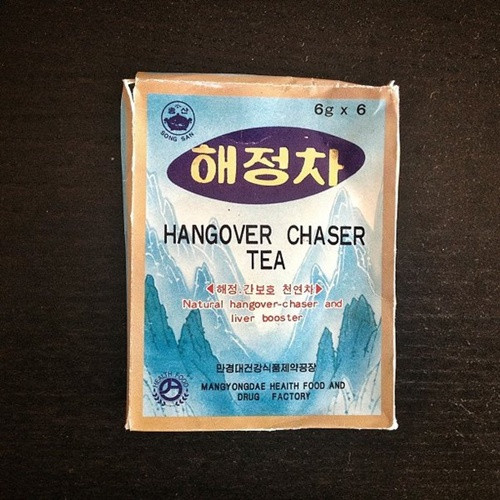 Gói trà giải rượu do Nhà máy Đồ uống và Thức phẩm Mangyongdae sản xuất. Hướng dẫn sử dụng của sản phẩm này ghi rõ "trà Haejong giúp giảm các triệu chứng say rượu, xua tan cảm giác đau đầu, chóng mặt, nôn nao, ăn không ngon và giảm mùi hôi trong miệng".