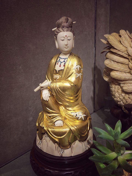 Phật Bà Quan Âm được tạc bằng nhiều chất liệu khác nhau: ngọc, đá quý, đồng, vàng, thạch cao… nhưng đối với bức tượng Phật Quan Âm tự tại làm bằng gỗ tiểu diệp tử đàn, ngà voi ma mút cùng vàng này đã cho thấy vẻ tinh tế từ nét mặt cho đến phong thái của phật bà Quan âm.
