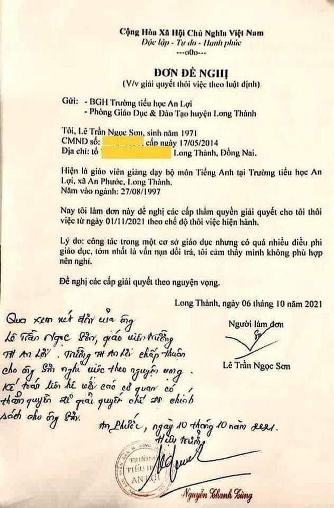 Theo quyết định của Trường Tiểu học An Lợi, huyện Long Thành, Đồng Nai, thầy Lê Trần Ngọc Sơn chính thức được giải quyết cho nghỉ việc từ ngày 1/1/2022. Lý do thôi việc là nghỉ theo nguyện vọng.