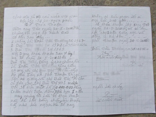 Anh Quyết cho rằng, con gà trống sau sự việc trên đã mất luôn “khả năng sinh sản" nên làm đơn gửi lên xã nhờ phân giải và đòi bố bồi thường 700.000 đồng. Số tiền tương đương với giá trị con gà mái, con gà trống bị què và ổ trứng bị đập vỡ. Mẹ anh Quyết làm nhân chứng cho con trai.