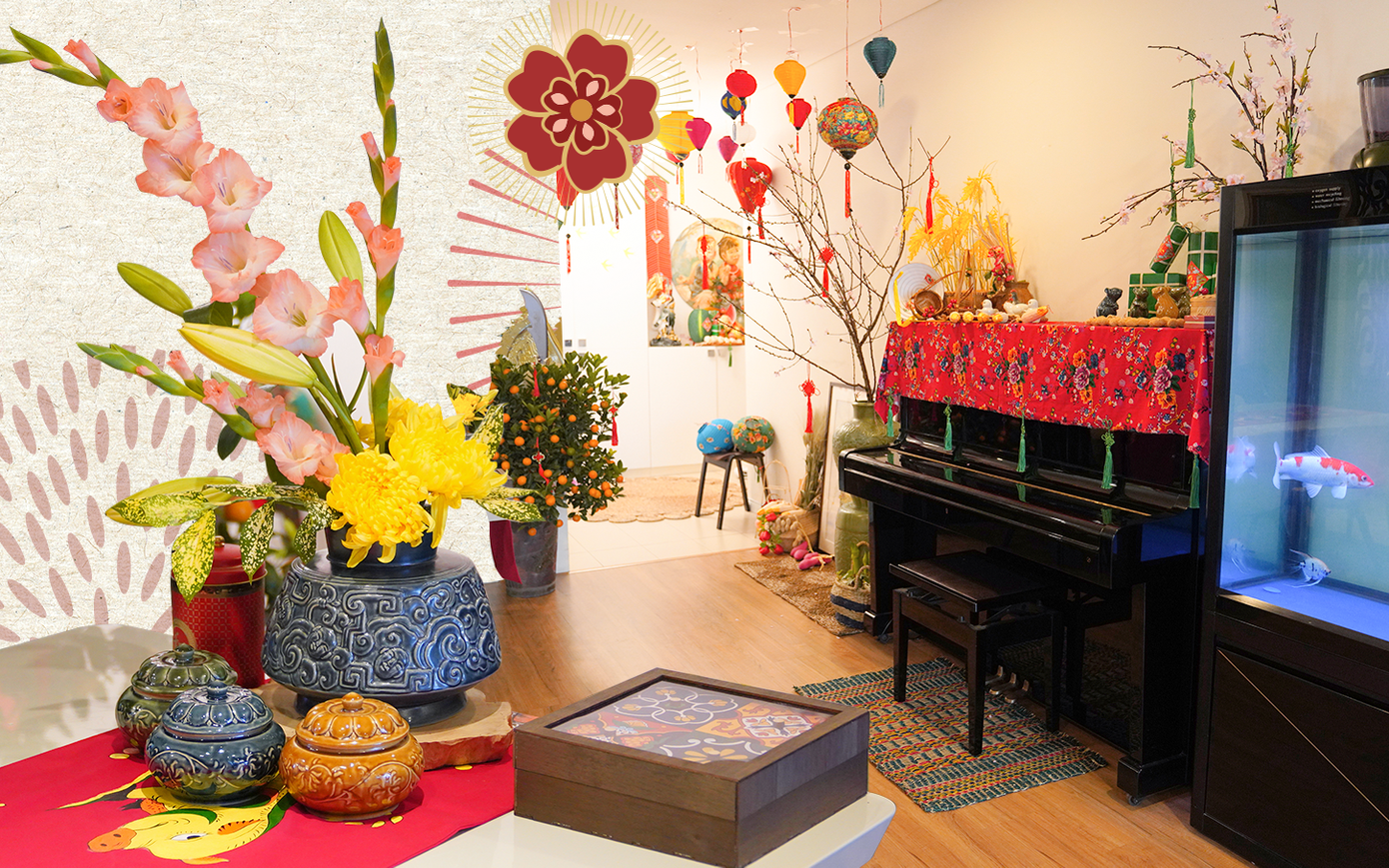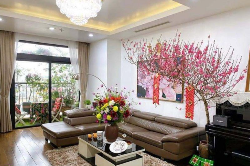 | Tết là thời điểm mà tất cả người thân cùng quây quần bên mâm cơm hay đơn giản là ngồi bên nhau nơi phòng khách, do đó gia chủ có thể đặt các bình hoa lớn như lan, tuyết mai, đào, mai, hoa ly trong phòng khách căn hộ bởi nó tượng trưng cho sự may mắn và tươi trẻ cho năm mới. |