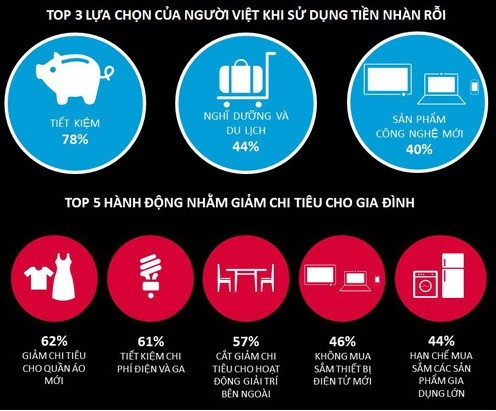Việt Nam là quốc gia có tỷ lệ tiết kiệm cao nhất (78%), tiếp theo là Indonesia (74%), Philippines (68%), Singapore (66%), Malaysia (65%) và Thái Lan (64%). Để làm đầy tài khoản tiết kiệm, đa số người tiêu dùng cắt giảm chi tiêu vào việc mua quần áo mới; cố gắng tiết kiệm tiền điện, gas, các chi phí giải trí gia đình hay trì hoãn việc nâng cấp các thiết bị công nghệ, thay thế các mặt hàng gia dụng lớn...
