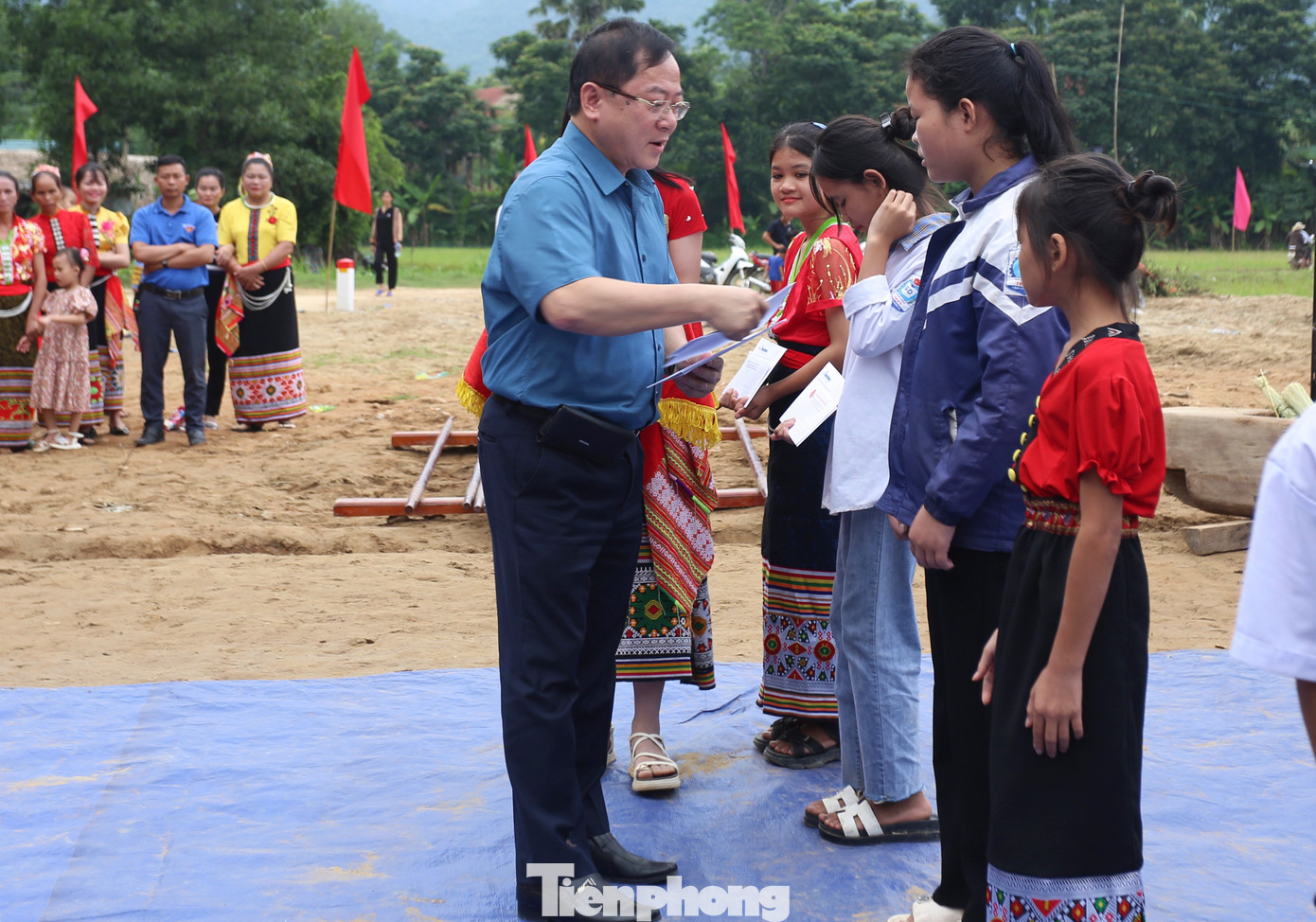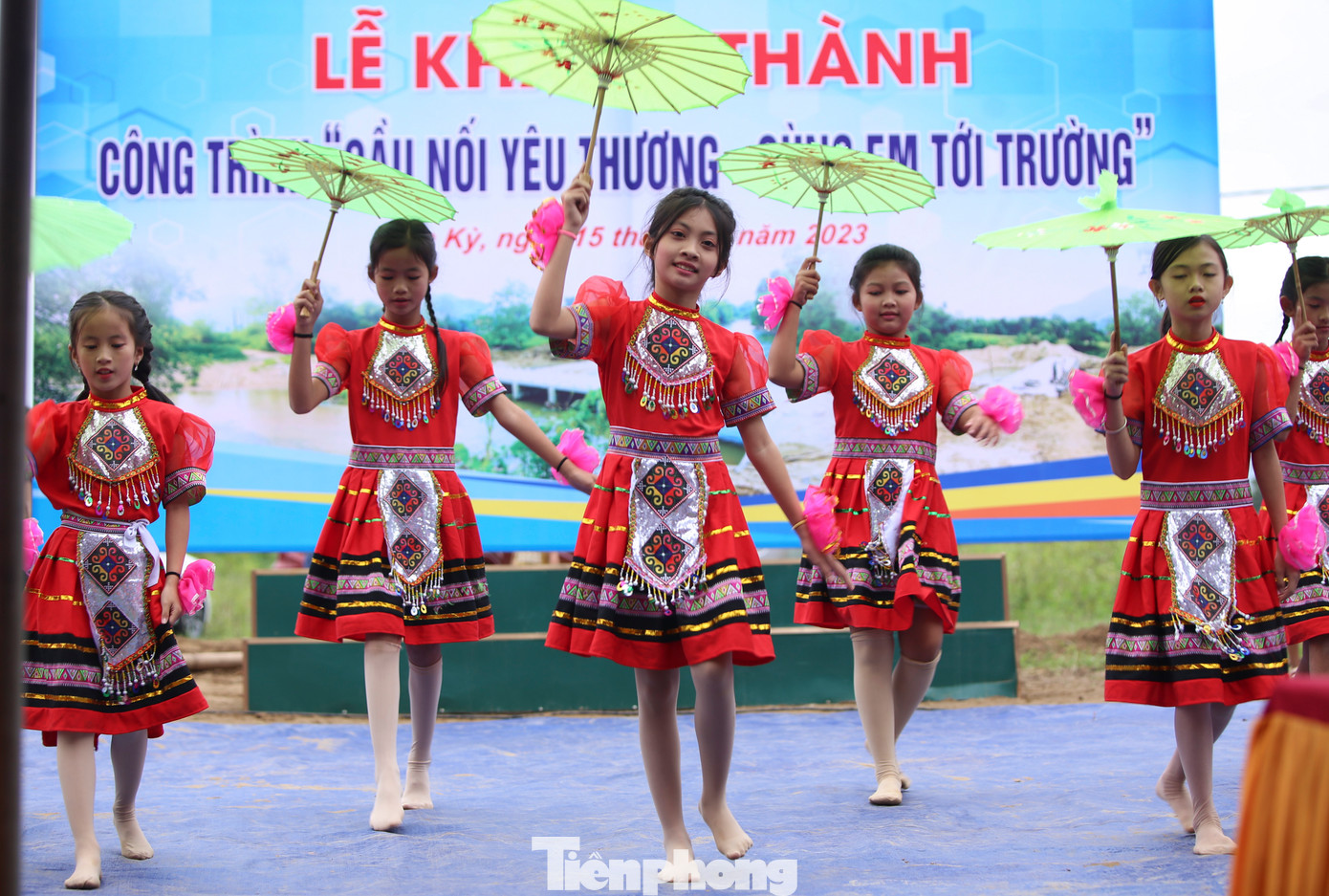 | "Tại lễ khánh thành cầu Bản Ỏn hôm nay, chúng tôi bày tỏ sự biết ơn và cảm ơn chân thành sâu sắc nhất tới sự hỗ trợ, đồng hành, ủng hộ của Báo Tiền Phong, Sở GD&ĐT, Tỉnh đoàn Nghệ An và các đơn vị tài trợ đã làm việc không quản ngày đêm, xây dựng công trình đảm bảo chất lượng, tiến độ, mỹ thuật theo yêu cầu đề ra", ông Giáp chia sẻ. Trong ảnh là lễ cắt băng khánh thành cầu tràn Bản Ỏn. |
