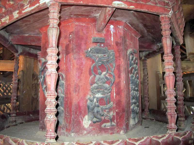 Tháp quay Cửu phẩm liên Hoa – Hoa sen chín tầng – Tháp cao chín tầng như 9 đài sen, 8 mặt đều đặn thể hiện 8 phương của nhà Phật, ngăn cách các tầng là một bức gỗ chạm cánh sen nở xoà bốn phía, đầu nhọn khối nổi phồng. Chín đài sen tượng trưng cho 9 cấp tu hành chính quả của Phật giáo.