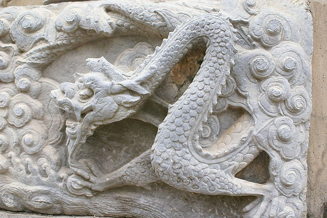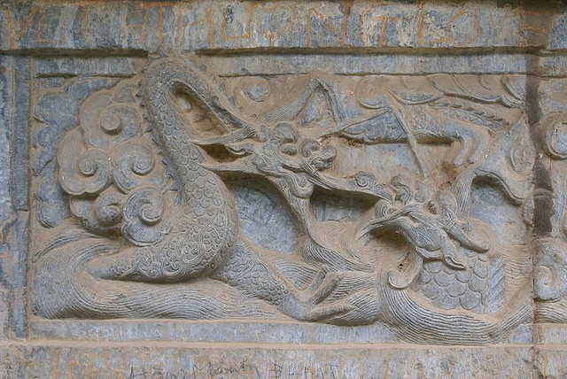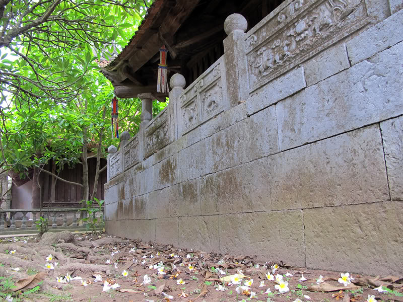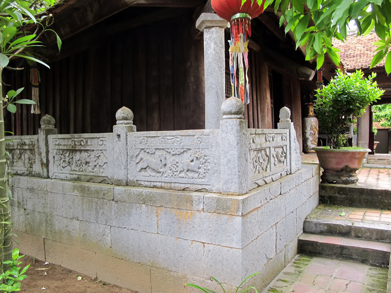 Phía ngoài Thượng điện có lan can bằng đá xanh bao quanh, có khắc hình chủ yếu là động vật, điểm xuyết thêm mây, trời, hoa, lá...
