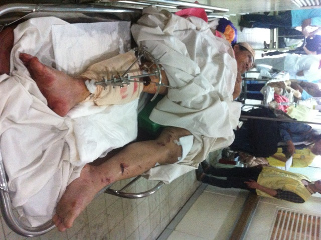 Chiều 15/4, bác sĩ Lê Văn Tuấn - Trưởng khoa Chấn thương chỉnh hình, Bệnh viện Chợ Rẫy cho biết, đã mổ cấp cứu 2 bệnh nhân nhập viện lúc 18h20 ngày 14/4 gồm ông Nguyễn Mạnh Hùng (49 tuổi) bị gãy hở 2 xương cẳng chân và ông Bùi Văn Thìn (39 tuổi) bị vỡ nhãn cầu mắt phải do vụ nổ ống dẫn khí trong khi bảo trì máy lạnh. Ngoài ra, ông Thìn còn bị vết thương nơi ngực phải, nách phải, rách tay 2 bên do các mảnh kim loại từ vụ nổ găm vào.
