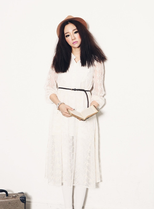 Đầm ren trắng liền thân cho các cô nàng ưa phong cách lãng mạn. Kiểu trang phục rất phù hợp với những buổi dạo phố mùa xuân.
