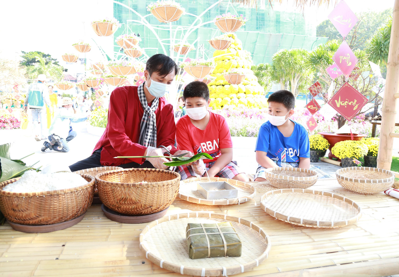 | Tại đây, bạn trẻ có dịp đằm mình trong hương vị Tết cổ truyền khi có thể trực tiếp gói bánh chưng, đi cầu khỉ, chơi tò he, chơi ô ăn quan, nhảy sạp bên những tràng hoa mai, hoa đào, hoa cúc đang rực rỡ khoe sắc trong nắng xuân... |