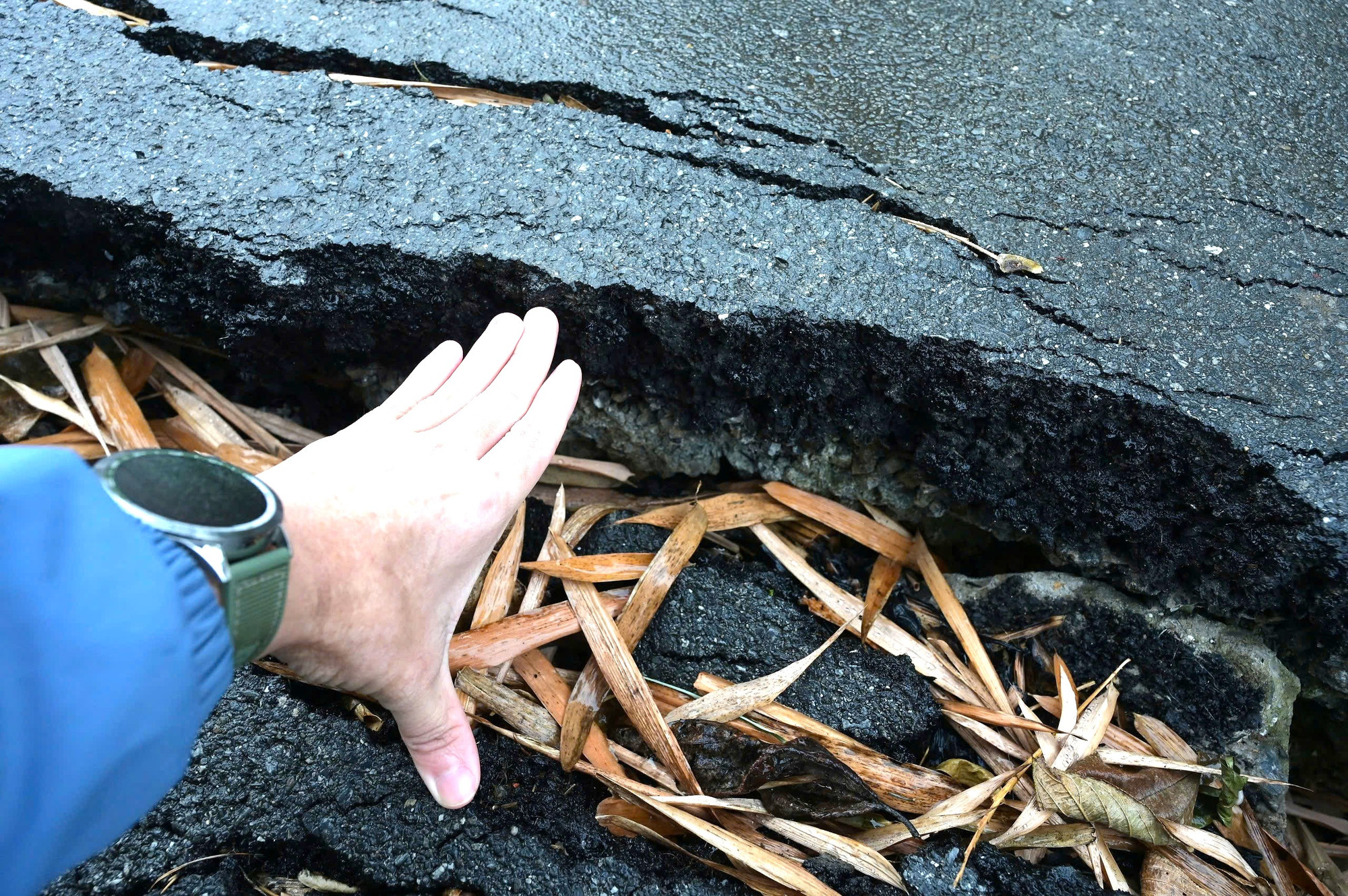 Tại đây, nhiều vết sạt trượt và khe nứt từ 10 đến 25cm đã xuất hiện trên nền đường, ăn sâu vào nền nhà, sân vườn của các hộ dân. Những vết nứt này chạy dài như những mạch máu bị vỡ trên cơ thể quả đồi, xuyên qua cả những bức tường kiên cố, những nền bê tông vững chắc, báo hiệu sự dịch chuyển không ngừng của đất đá.