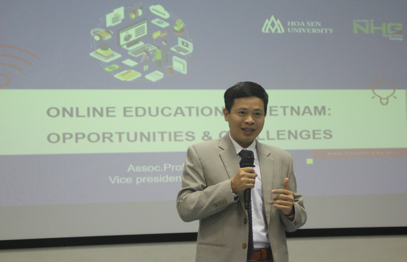 Anh Nhẫn Đỗ (áo xanh, bên phải) cùng thầy Vũ (áo xám, bên trái) đã có những chia sẻ về học online dành cho thầy cô và teen Việt thông qua nền tảng của ClassIn. Ảnh: Đại học Hoa Sen Anh Nhẫn chia sẻ, mỗi nền tảng dạy học trực tuyến sẽ có những quy cách sử dụng riêng và thường những phần mềm "xịn", sẽ khá phức tạp trong bước đầu sử dụng. Chính vì vậy, nhiều trường học, thay vì có những hướng dẫn cụ thể dành cho giáo viên và học sinh thì lại chọn các ứng dụng "mỳ ăn liền". Các nền tảng này thoạt nhìn có thể đơn giản bằng cách cho phép đăng tải miễn phí các bài tập, bài giảng, nhưng sẽ làm giảm khả năng tương tác giữa các thầy cô và teen khiến nhiều bạn ỷ lại, không phát huy được tinh thần học tập.