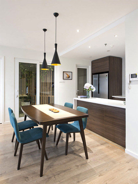 Khu bếp, bàn ăn, phòng khách được liên thông và nhận ánh sáng từ cửa sổ lớn. Chị Hiền tâm sự, trước chị rất lười ăn sáng, nhưng từ khi có nhà mới, chị cảm thấy mỗi sớm ngồi ở bàn ăn, nhìn ra phía cửa sổ thấy rất thư thái. Việc lấy đồ ở bàn bếp sau lưng cũng thuận tiện.