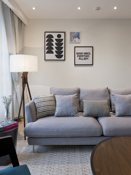 Những bức tranh tối giản được bố trí lệch về phía cửa sổ, kết hợp với đèn cây tạo thành góc thư giãn thú vị. Đó cũng là các tác phẩm do chính kiến trúc sư sáng tạo và sẽ được thay đổi khi chủ nhà muốn có sự mới lạ.