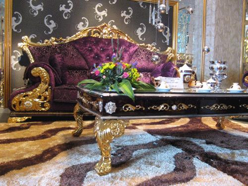 Bộ bàn ghế tiếp khách bề thế dát vàng 24k có giá trên 1 tỷ đồng hay chiếc giường ngủ kèm theo bàn trang điểm, tủ đựng quần áo trên đầu được dát vàng long lanh có giá trên 1,1 tỷ đồng khuyến nhiều người ngỡ ngàng.