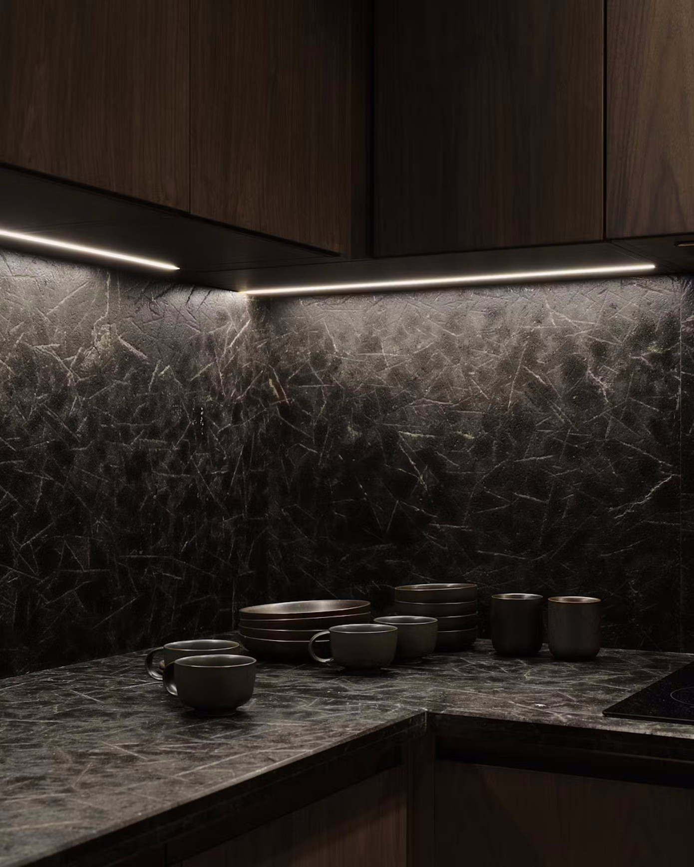 Thủ pháp đặc sắc là xoá mờ ranh giới thị giác: bếp hoà vào nhịp tấm ốp tường và tủ âm tạo mặt phẳng liền mạch từ cửa đến phòng ngủ.
