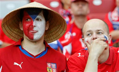 Một cổ động viên CH Séc đã đội chiếc nón lá đặc trưng của Việt Nam khi đến cổ vũ đội nhà trong trận tứ kết Euro 2012 với Bồ Đào Nha trên sân vận động quốc gia Warsaw (Ba Lan) rạng sáng 22-6.