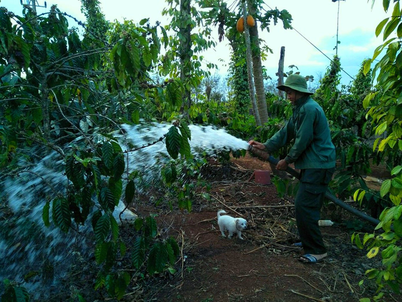 Sáng mùng 2 tết, gia đình ông Thái Văn Hoan (xã Ea Tar, huyện Cư M'Gar) tất bật lắp máy, kéo ống tưới gần 1 ha cà phê. Ông Hoan cho biết: “Tôi tưới bằng nước giếng nên lượng nước có hạn, phải cầm vòi tưới trực tiếp vào cây, ngày tưới khoảng 6-7 tiếng là hết nước. Cà phê là giống cây trồng cần nhiều nước, nên được tưới thành nhiều đợt. Mọi năm, trước tết tôi tưới xong một đợt, năm nay chưa tưới đợt nào, nếu không tưới kịp thời cuối năm không có thu hoạch”.