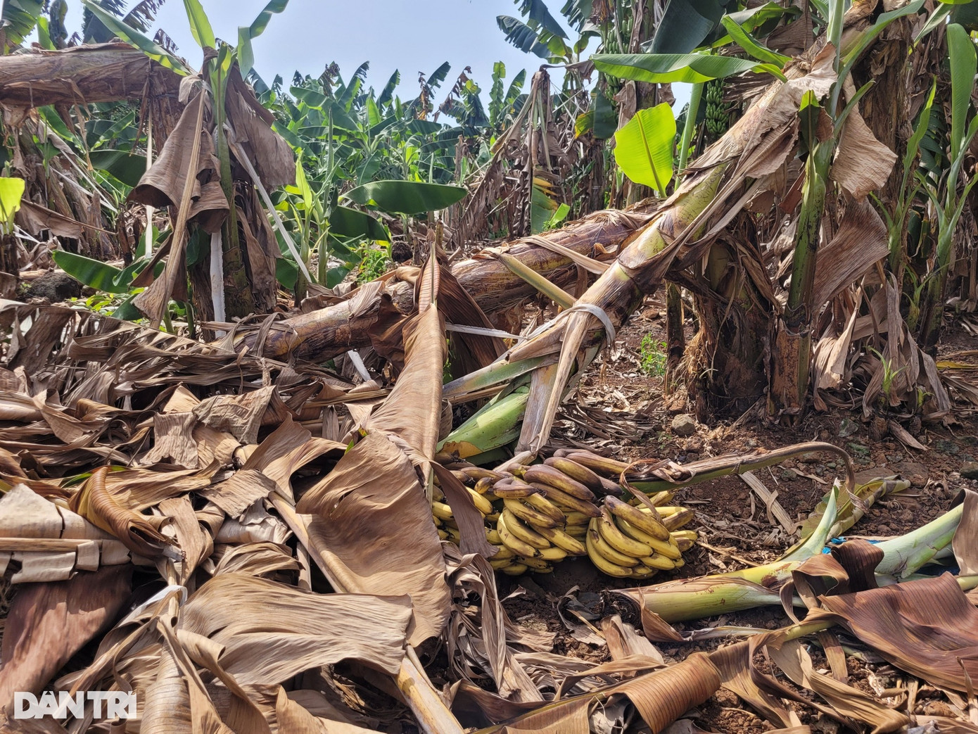 Nhiều vườn chuối ở xã Thanh Bình (huyện Trảng Bom), chủ vườn chấp nhận để chuối chín trên cây không thu hoạch do không có thương lái đến mua.