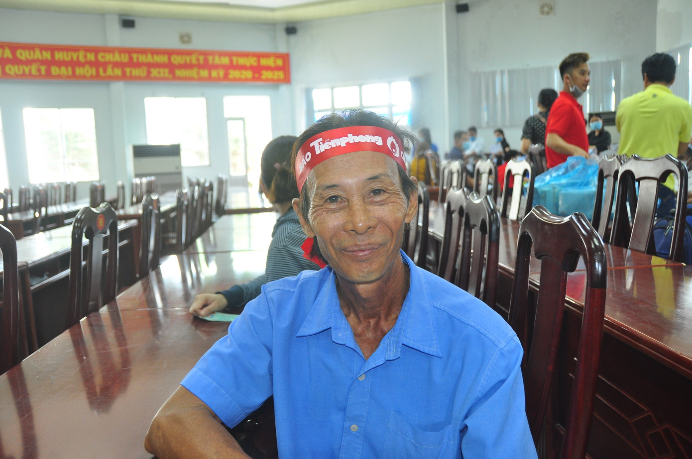Ông Lê Văn Hải, 56 tuổi ở ấp xây Đá A, xã Hồ Đắc Kiện (Châu Thành) 6 lần tham gia hiến máu. Từ sáng sớm, ông đã đi đến Hội trường UBND huyện Châu Thành để hiến máu rồi mới về nhà đi ra đồng. "Nghe mấy cháu ở xã nói hôm nay hiến máu nên tôi tranh thủ lên đây hiến. Bây giờ mình có thể chia sẻ những gì cho xã hội được thì làm", ông Hải nói.