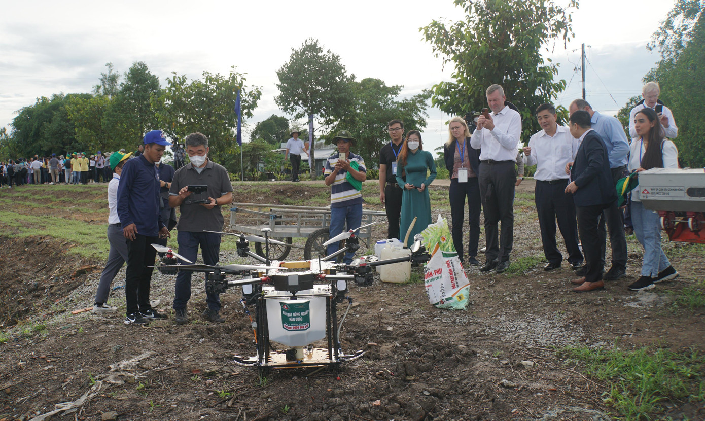 | Sự kiện AGRITECHNICA ASIA Live 2022 được tổ chức nhằm thúc đẩy áp dụng cơ giới hóa và nông nghiệp số để chuyển đổi sản xuất nông nghiệp bền vững, đồng thời góp phần chuyển đổi tư duy sản xuất nông nghiệp sang kinh tế nông nghiệp ở Việt Nam. Trong nhiều nội dung của sự kiện thì các mô hình sản xuất và trình diễn máy móc trên đồng ruộng đã và đang thực hiện tại Viện lúa ĐBSCL thu hút đông đảo khách và người dân đến xem. Ảnh: Hòa Hội |