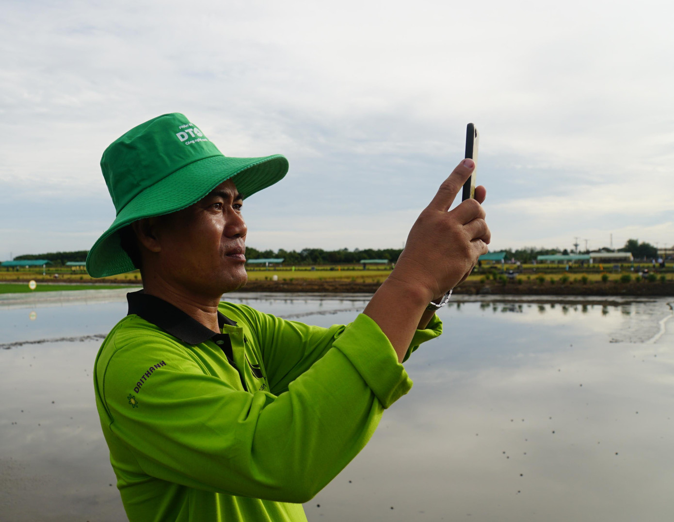 | Khách quốc tế dõi theo máy bay không người lái phun thuốc trên đồng. Ảnh: Hòa Hội |