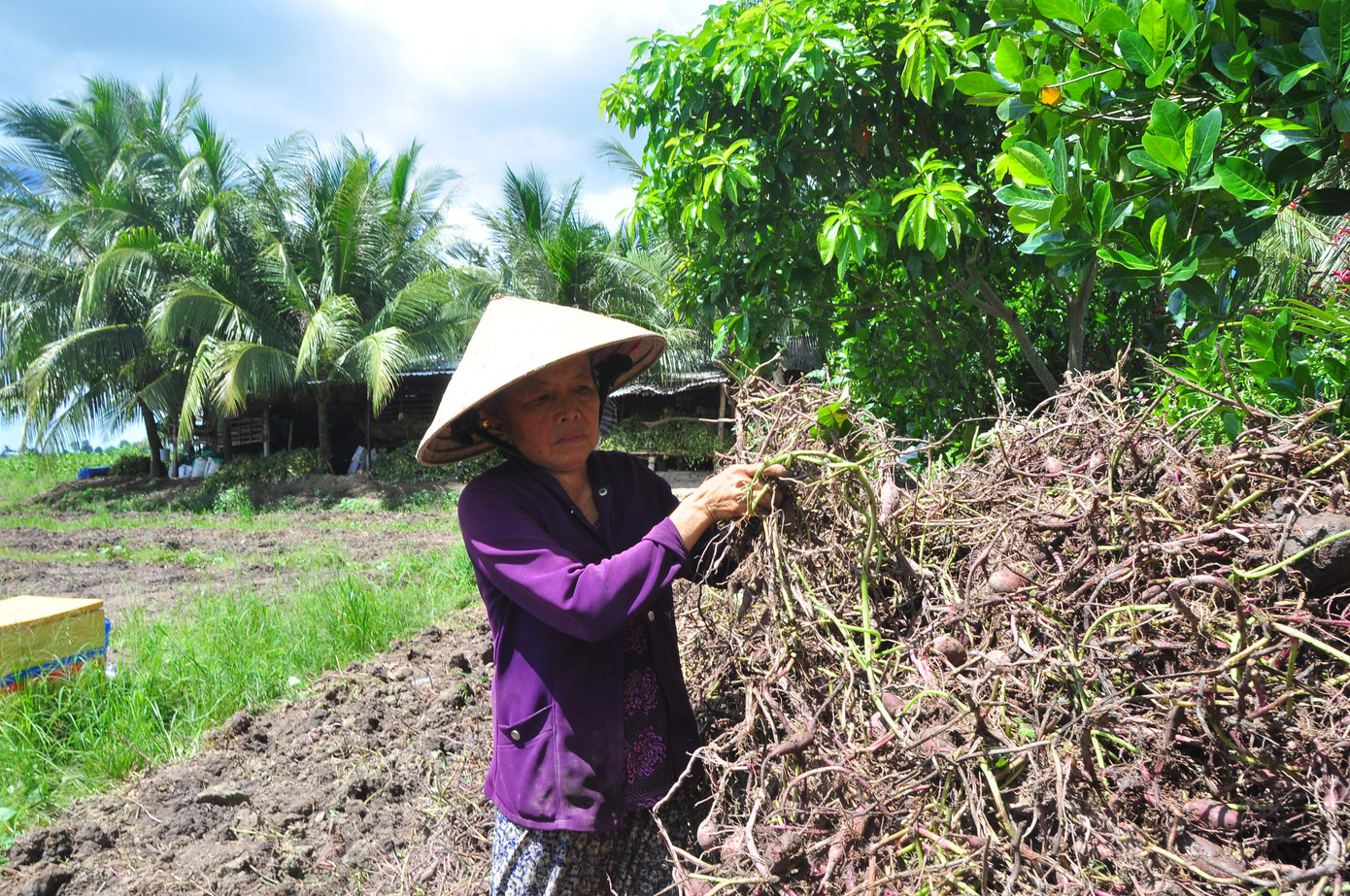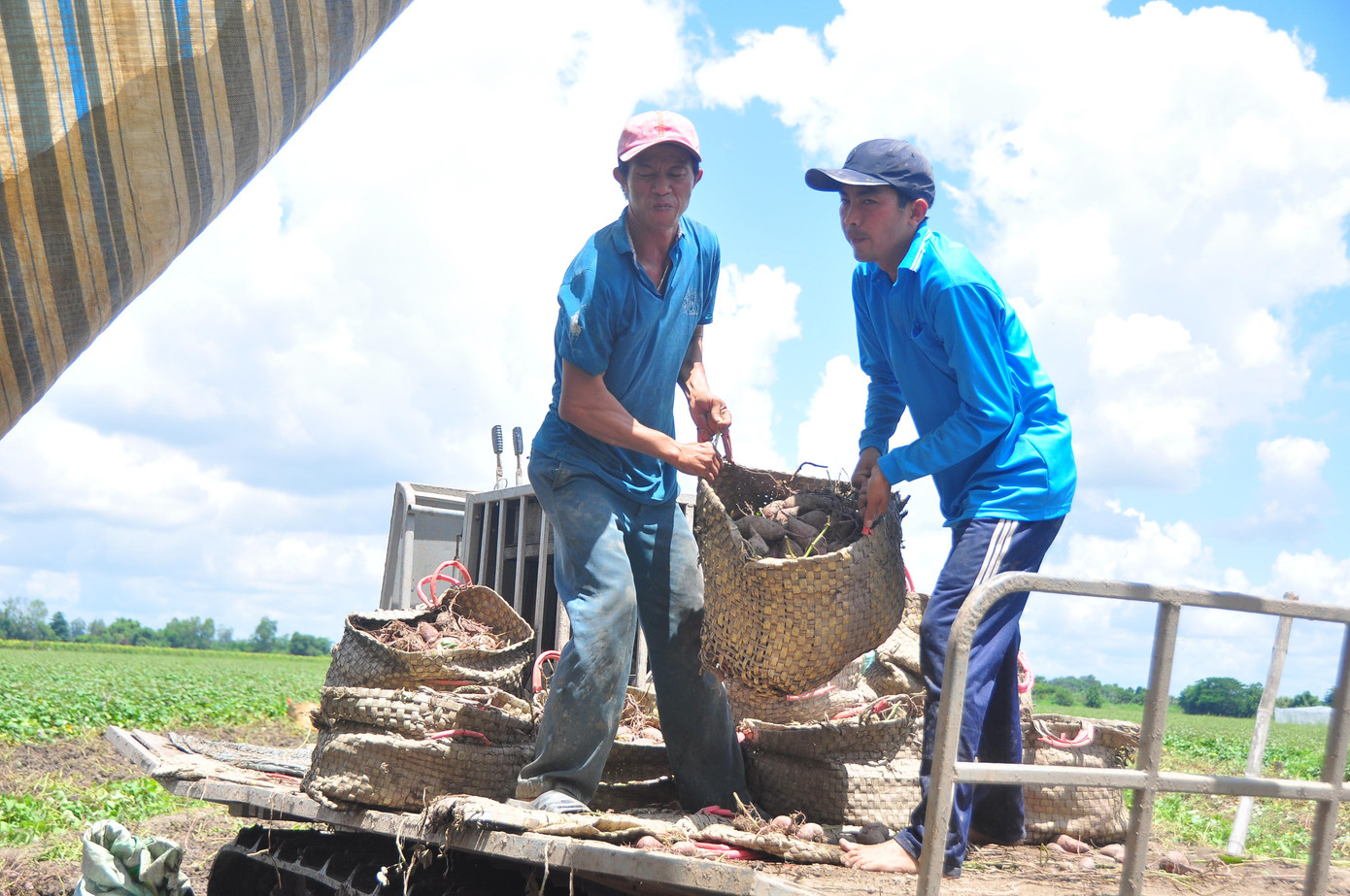 | Nông dân thu hoạch khoai lang ngày 29/5 tại xã Tân Thành, huyện Bình Tân, tỉnh Vĩnh Long |