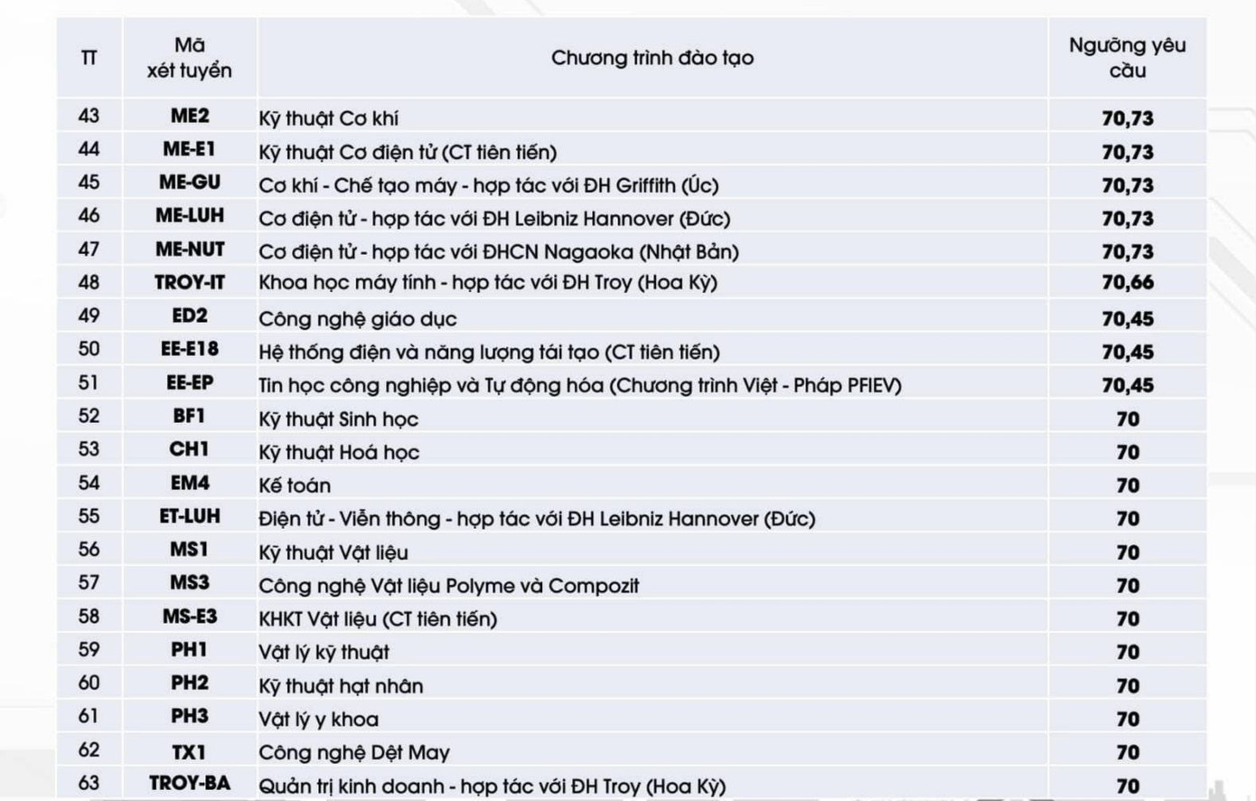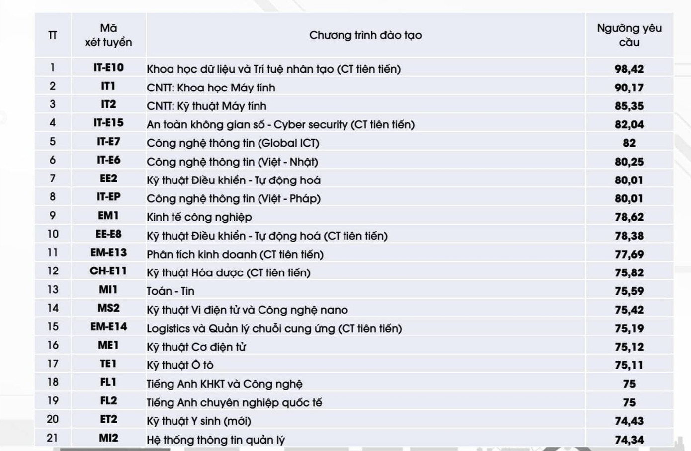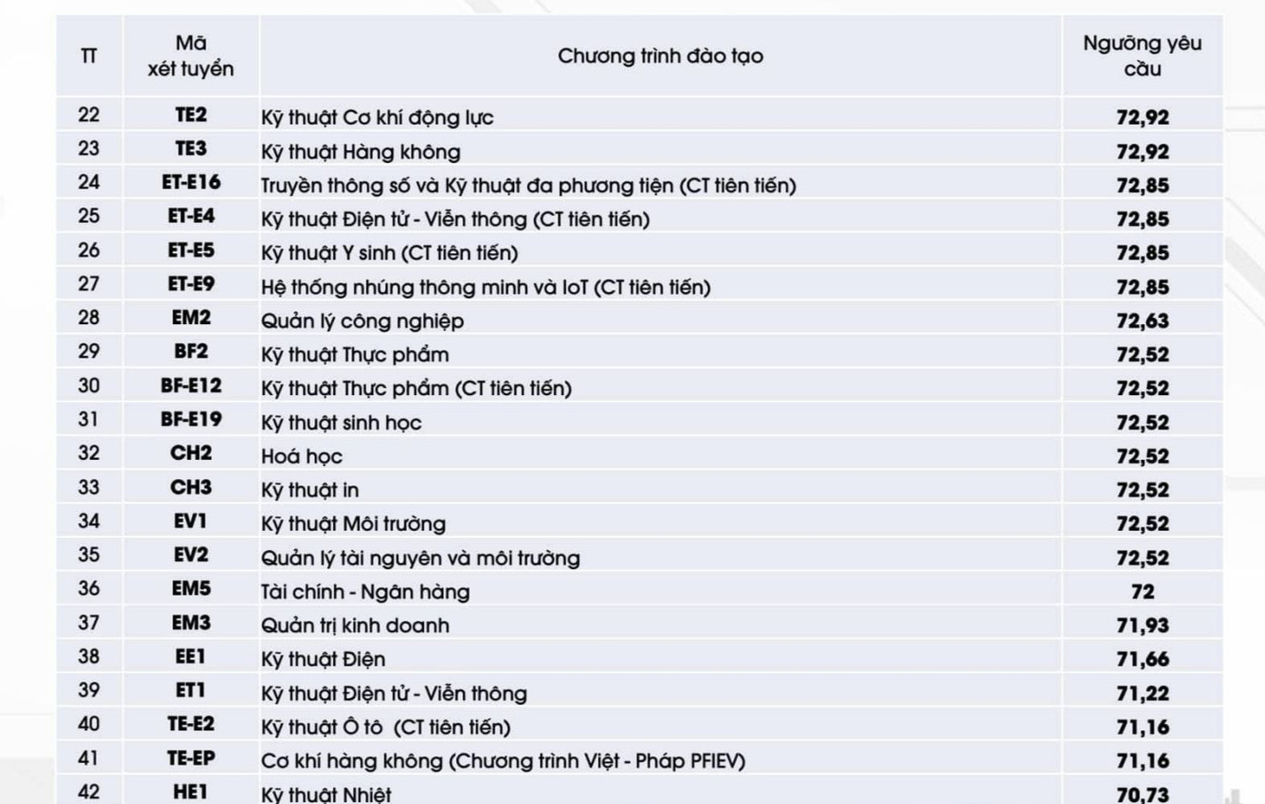 Hội đồng tuyển sinh Đại học Bách khoa Hà Nội (ĐHBKHN) vừa thông báo ngưỡng yêu cầu đối với các thí sinh đăng ký xét tuyển vào các ngành/chương trình đào tạo ĐH chính quy năm 2023 theo phương thức xét tuyển tài năng.