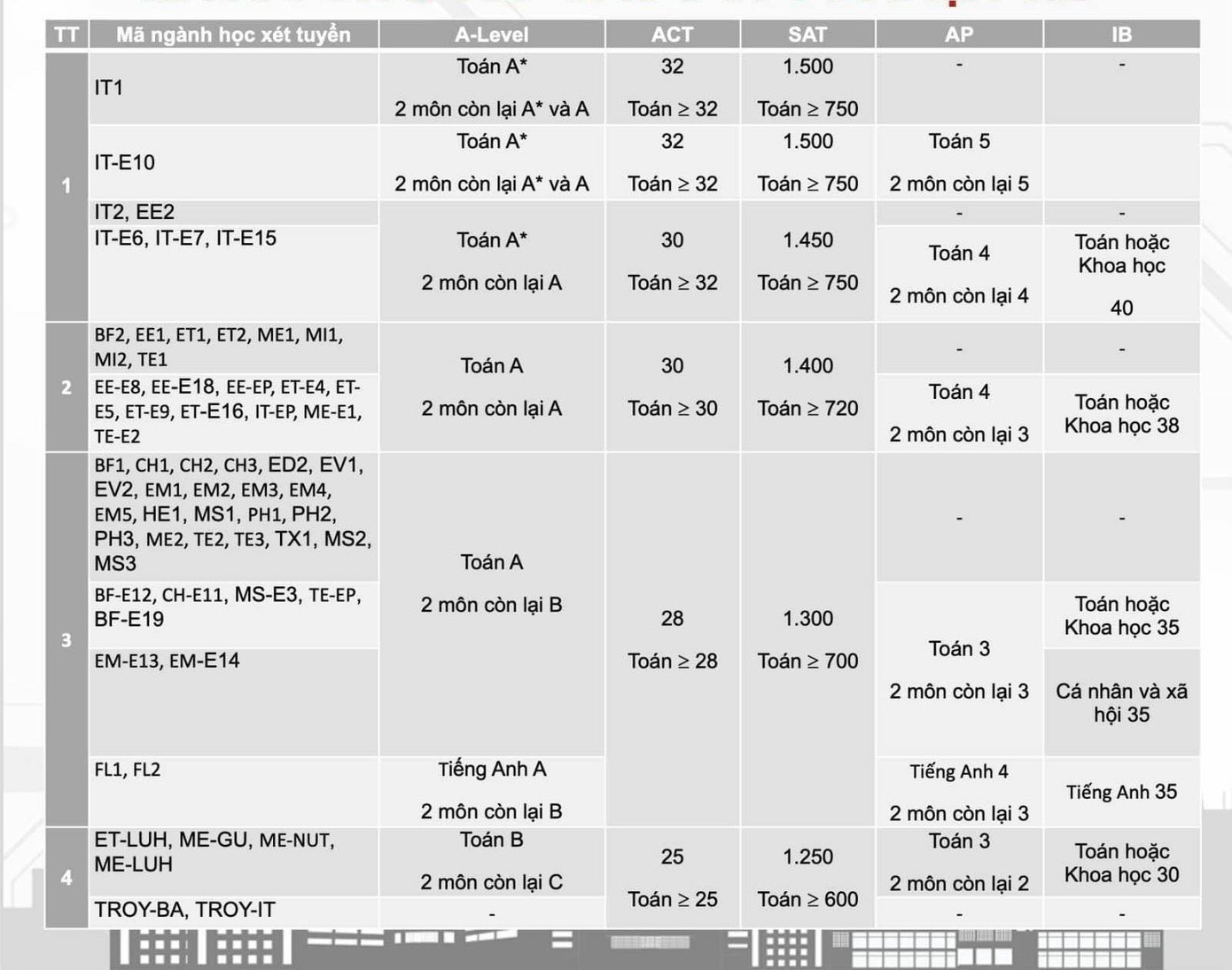 Ngưỡng yêu cầu đối với thí sinh diện 1.2 (chứng chỉ đánh giá năng lực quốc tế) như sau: