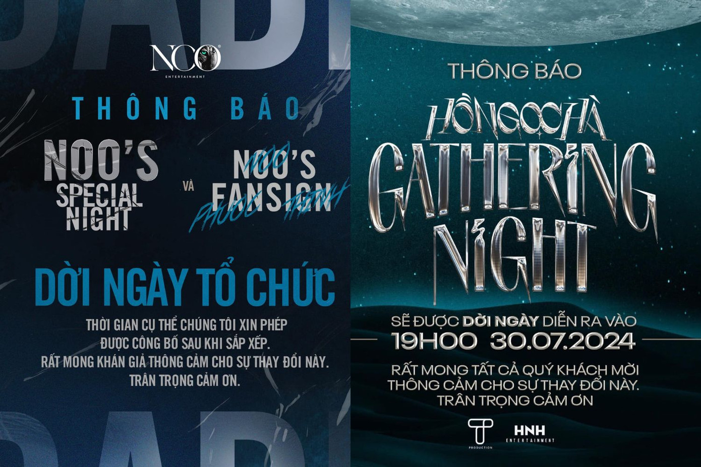 Ca sĩ Noo Phước Thịnh đăng tải thông báo dời ngày tổ chức đêm nhạc Noo's Special Night - trước đó dự kiến diễn ra vào ngày 21/7. Phía BTC cho biết sẽ công bố thời gian cụ thể quay trở lại sau khi sắp xếp và mong khán giả thông cảm. Cũng trong tối cùng ngày, trên trang cá nhân, ca sĩ Hồ Ngọc Hà cho biết sự kiện Hồ Ngọc Hà - Gathering Night sẽ dời ngày tổ chức lại 1 tuần so với lịch dự kiến (tức dời đến 30/7).