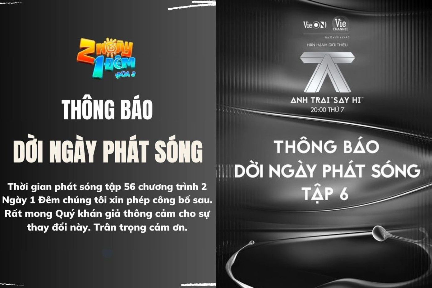 Bên cạnh đó, các chương trình gameshow giải trí như Anh Trai Vượt Ngàn Chông Gai, Anh Trai "Say Hi", 2 Ngày 1 Đêm, Đảo Thiên Đường cũng lần lượt thông báo dời lịch phát sóng cho đến khi có thông báo mới. Trên truyền hình, khung giờ lên sóng của Anh Trai Vượt Ngàn Chông Gai (VTV3) được thay thế bằng phim tài liệu Sức Sống Cồn Cỏ, phim Tôi Tái Sinh (HTV2) sẽ lên sóng thay Anh Trai "Say Hi",...