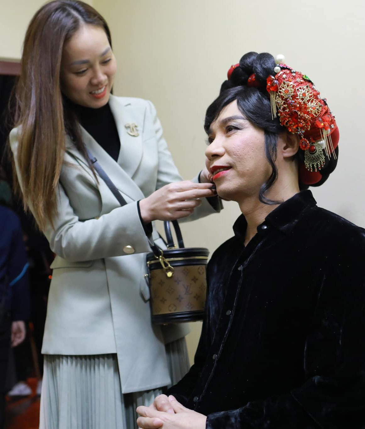 | NSND Công Lý được vợ là phóng viên Ngọc Hà chăm sóc chu đáo trong quá trình ghi hình Táo Quân 2023. |