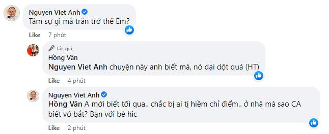 Ngay sau đó, nhiều khán giả và đồng nghiệp để lại những lời động viên nữ nghệ sĩ. Trong số đó, đáng chú ý nhất là dòng bình luận của NSND Việt Anh. Trả lời thắc mắc của đàn anh, Hồng Vân nói: "Chuyện này anh biết mà, nó dại dột quá (HT)". Đáp lại, NSND Việt Anh chia sẻ: "Anh mới biết tối qua, chắc bị ai tị hiềm chỉ điểm. Ở nhà mà sao công an biết vô bắt? Bạn với bè!".