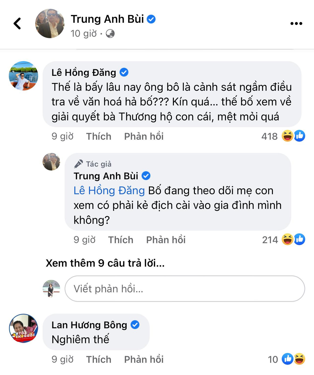 Diễn viên Bảo Anh đùa: “Hoá ra Lương Bổng mới là cảnh sát ngầm, con Bảo Ngậu giờ là giang hồ xịn rồi chú ạ”. “Thế là bấy lâu nay ông bô là cảnh sát ngầm điều tra về văn hoá hả bố??? Kín quá… thế bố xem về giải quyết bà Thương hộ con cái, mệt mỏi quá”, Hồng Đăng hài hước. Nhiều diễn viên cũng cảm thán về hình ảnh mới của NSND Trung Anh.