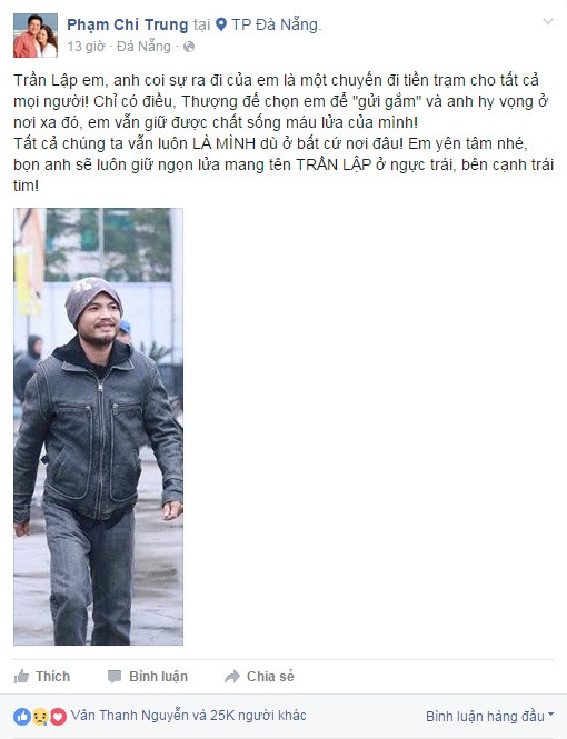 Tất cả chúng ta vẫn luôn là mình dù ở bất cứ nơi đâu! Em yên tâm nhé, bọn anh sẽ luôn giữ ngọn lửa mang tên Trần Lập ở ngực trái, bên cạnh trái tim”.