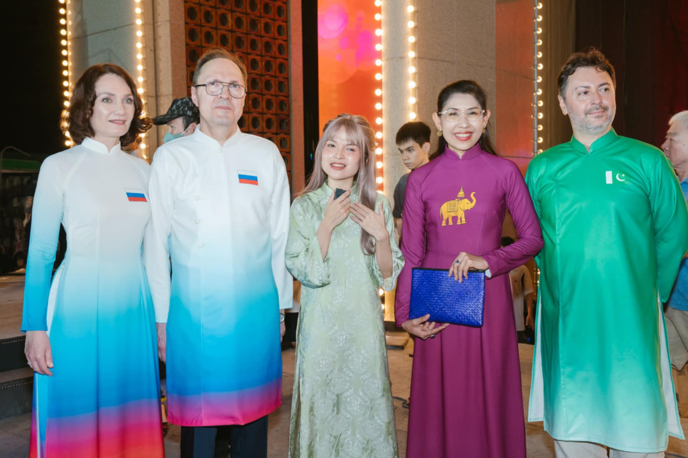 Bộ sưu tập Hòa bình rực rỡ, với sắc màu quốc kỳ được chuyển sắc qua kỹ thuật ombre trên nền áo dài truyền thống, như những dải lụa ngập nắng, mang theo thông điệp của tình bạn, của sự đồng điệu, và của một thế giới chan hòa ánh sáng hòa bình.