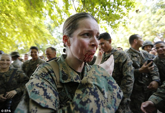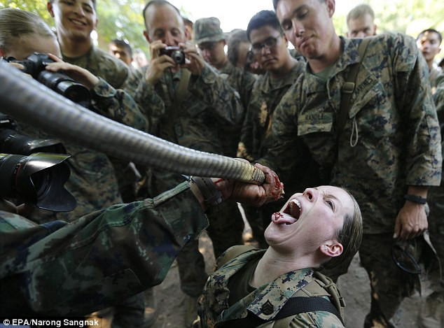 Các nữ binh Mỹ đã chứng tỏ sự gan dạ và dũng cảm chẳng hề thua kém các đồng nghiệp nam khi luyện uống máu rắn hổ mang trong bài tập sinh tồn.