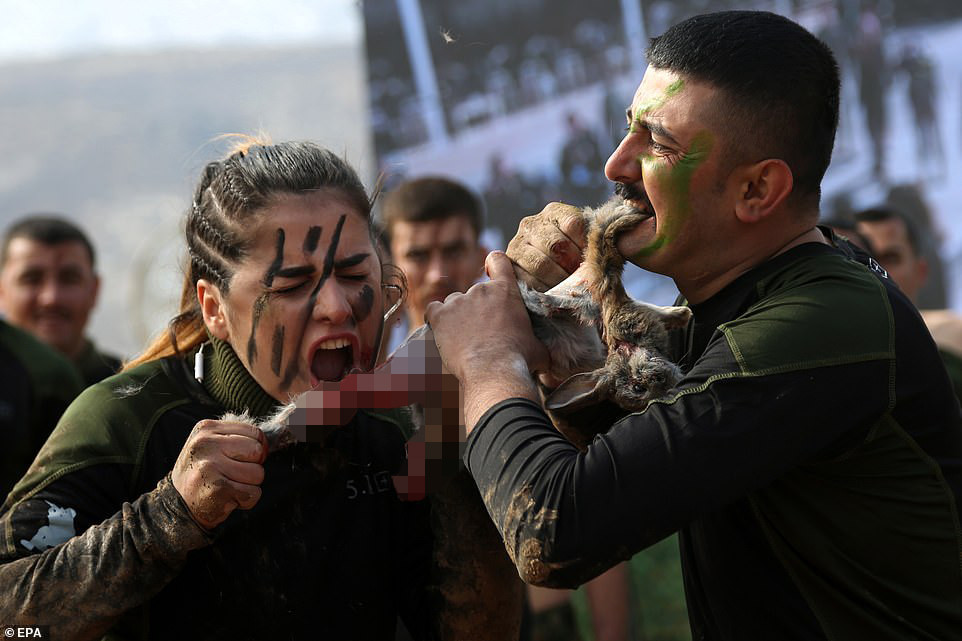 Tại buổi lễ, các nữ học viên thể hiện sức mạnh bằng cách lăn qua bùn. đánh bại các nam học viên, thậm chí ăn sống rắn và xé xác thỏ bằng răng.
