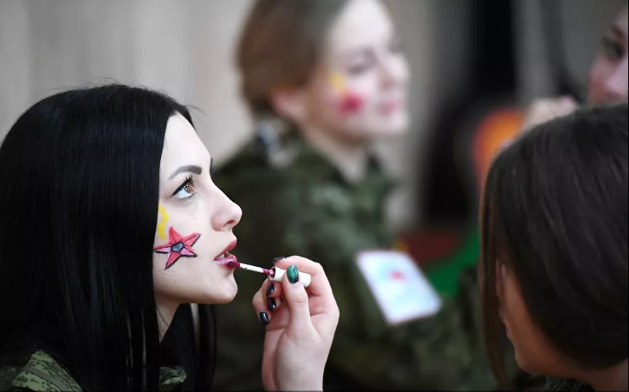 "Trang điểm dưới lớp ngụy trang"- một cuộc thi đặc biệt dành cho 50 nữ quân nhân đến từ khắp nước Nga vào dịp ngày Quốc tế phụ nữ 8/3 đến gần. Ảnh: Sputnik