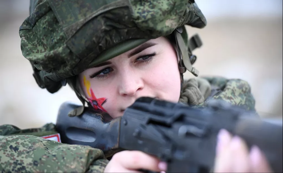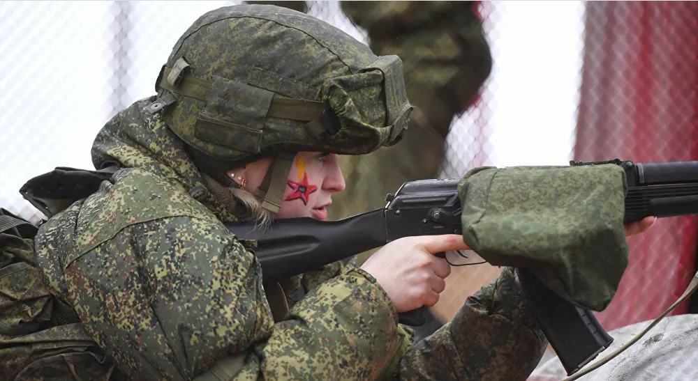 Một nữ binh sĩ đang ngắm bắn. Ảnh: Sputnik