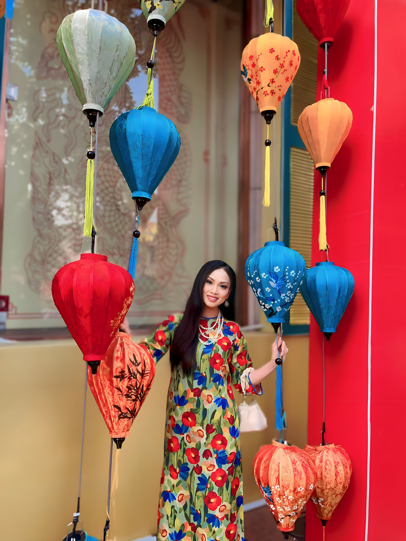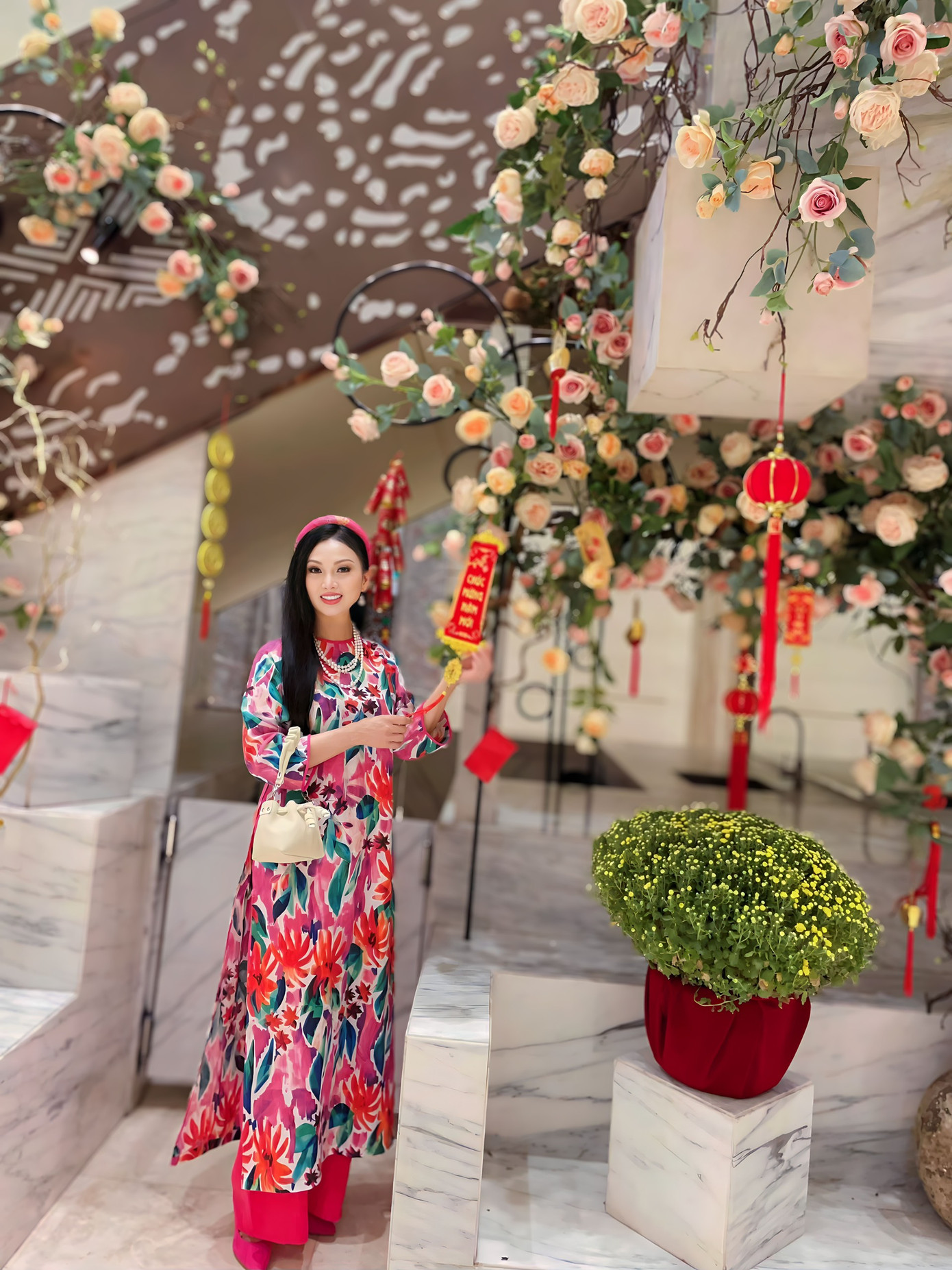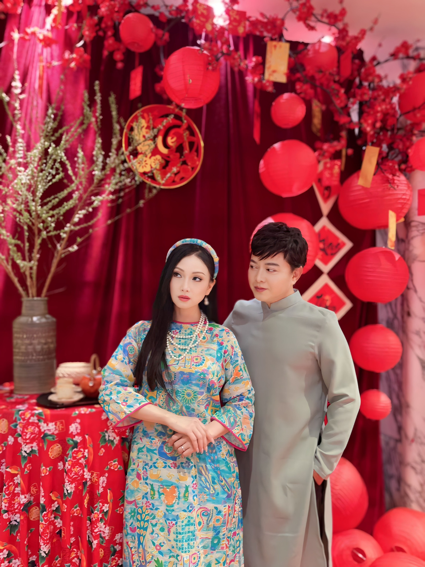 Nếu như Trần Sang lựa chọn áo dài trơn một màu thì 'nữ ca sĩ tỷ phú' lại nhanh nhạy bắt nhịp xu hướng thời trang sắc màu cùng họa tiết rực rỡ của các bạn gen Z hiện nay.