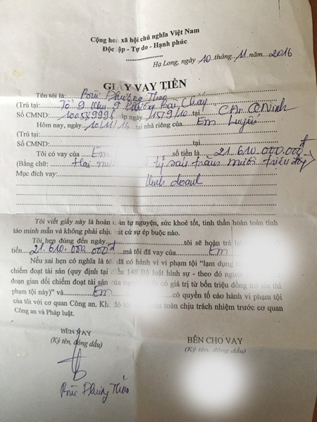 Bà N.T.D. chủ nợ sinh sống tại Bãi Cháy, TP Hạ Long nói đã cho Thảo vay trên 20 tỷ đồng. Theo bà D., lần trước Thảo vay tiền nói để giải quyết việc cho người thân và đã trả rất sòng phẳng. Lần này Thảo nói vay tiền để giải quyết công việc cho chồng nên tôi rất tin tưởng không mảy may nghi ngờ.