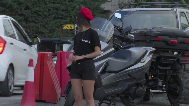 Thay thế trang phục truyền thống quen thuộc, những nữ cảnh sát xinh đẹp trở nên thu hút hơn với áo phông ngắn tay, quần short màu đen, nổi bật cùng chiếc mũ nồi đỏ và gương mặt trang điểm đậm nét.