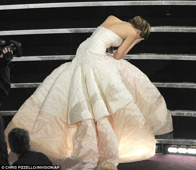 Đây không phải là sự cố duy nhất xảy ra với Jennifer trong đêm trao giải Oscar. Trước đó, khi được xướng tên là Nữ diễn viên chính xuất sắc nhất, Jennifer đã vô cùng xúc động và bị vấp vào tà váy khiến cô ngã dúi về phía trước khi tiến lên sân khấu để nhận tượng vàng.