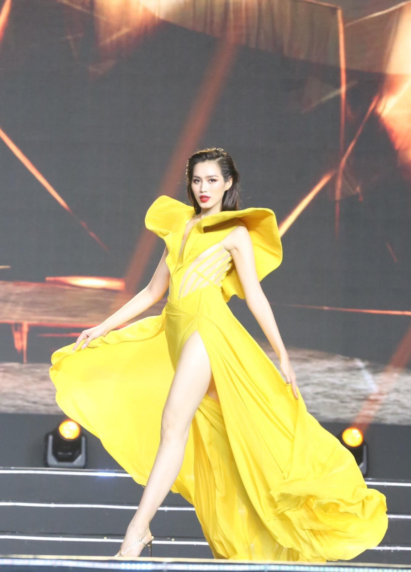 Đỗ Thị Hà chứng tỏ bản lĩnh và thần thái rạng ngời của đương kim hoa hậu trong bộ váy dạ hội vàng lộng lẫy.
